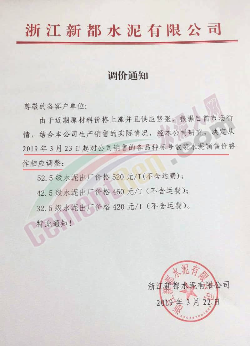 浙江新都水泥有限公司調(diào)價(jià)通知稱,由于近期原材料價(jià)格上漲并且供應(yīng)緊張,根據(jù)目前市場(chǎng)行情,結(jié)合本公司生產(chǎn)銷售實(shí)際情況,經(jīng)本公司研究決定從3月23日起對(duì)公司銷售的各品種標(biāo)號(hào)散裝水泥銷售價(jià)格作相應(yīng)調(diào)整: