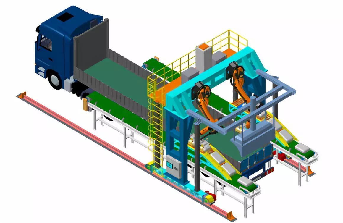 輸入裝車重量,開啟設(shè)備,當(dāng)水泥袋通過(guò)皮帶輸送到裝車位置時(shí),控制系統(tǒng)發(fā)出指令,機(jī)器人將水泥袋搬運(yùn)到待裝載車輛中,當(dāng)前位置裝載完成后,桁架通過(guò)軌道沿車輛方向移動(dòng),繼續(xù)其他位置的裝載。達(dá)到裝載重量后,設(shè)備停止運(yùn)行,車輛離開裝車區(qū)域。