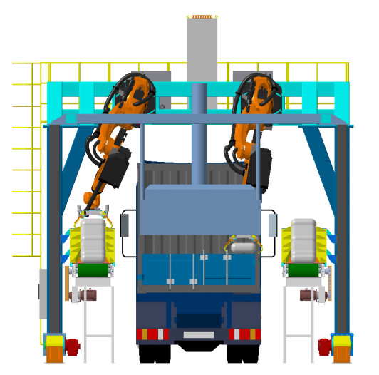 袋裝水泥智能裝車系統(tǒng),通過(guò)伺服系統(tǒng)控制機(jī)器人抓手上下擺動(dòng)來(lái)進(jìn)行裝車碼垛,這樣可以省時(shí)省力。此過(guò)程完全自動(dòng)化,不需要人工輔助,是現(xiàn)代生產(chǎn)線裝車自動(dòng)化的理想設(shè)備。袋裝水泥智能裝車系統(tǒng)由桁架、工業(yè)機(jī)器人、控制系統(tǒng)、收塵系統(tǒng)等部分組成。裝載前,待裝載車輛進(jìn)入指定位置,通過(guò)桁架上的紅外激光掃描,確定車輛的大小及停放位置,桁架通過(guò)軌道移動(dòng)到車輛貨箱前端裝包區(qū)域。