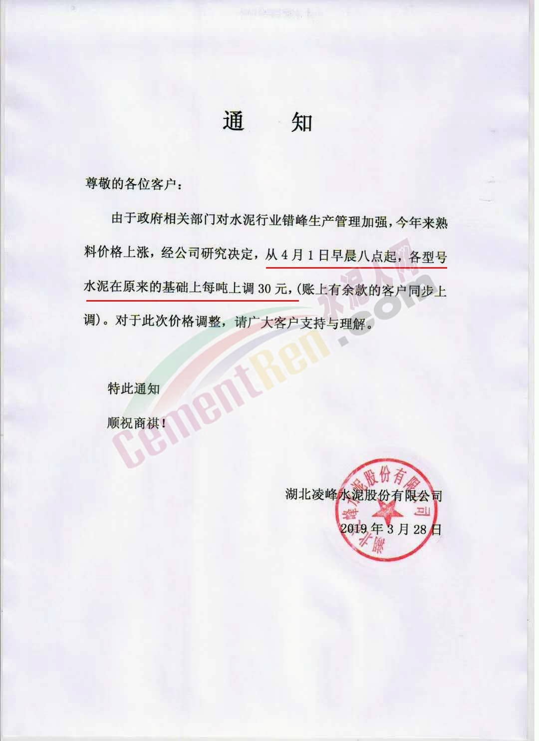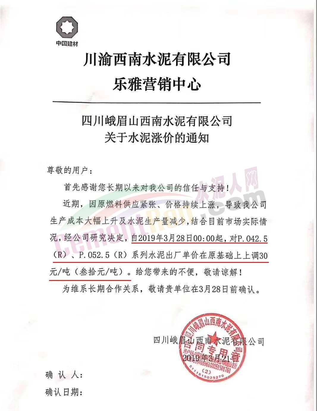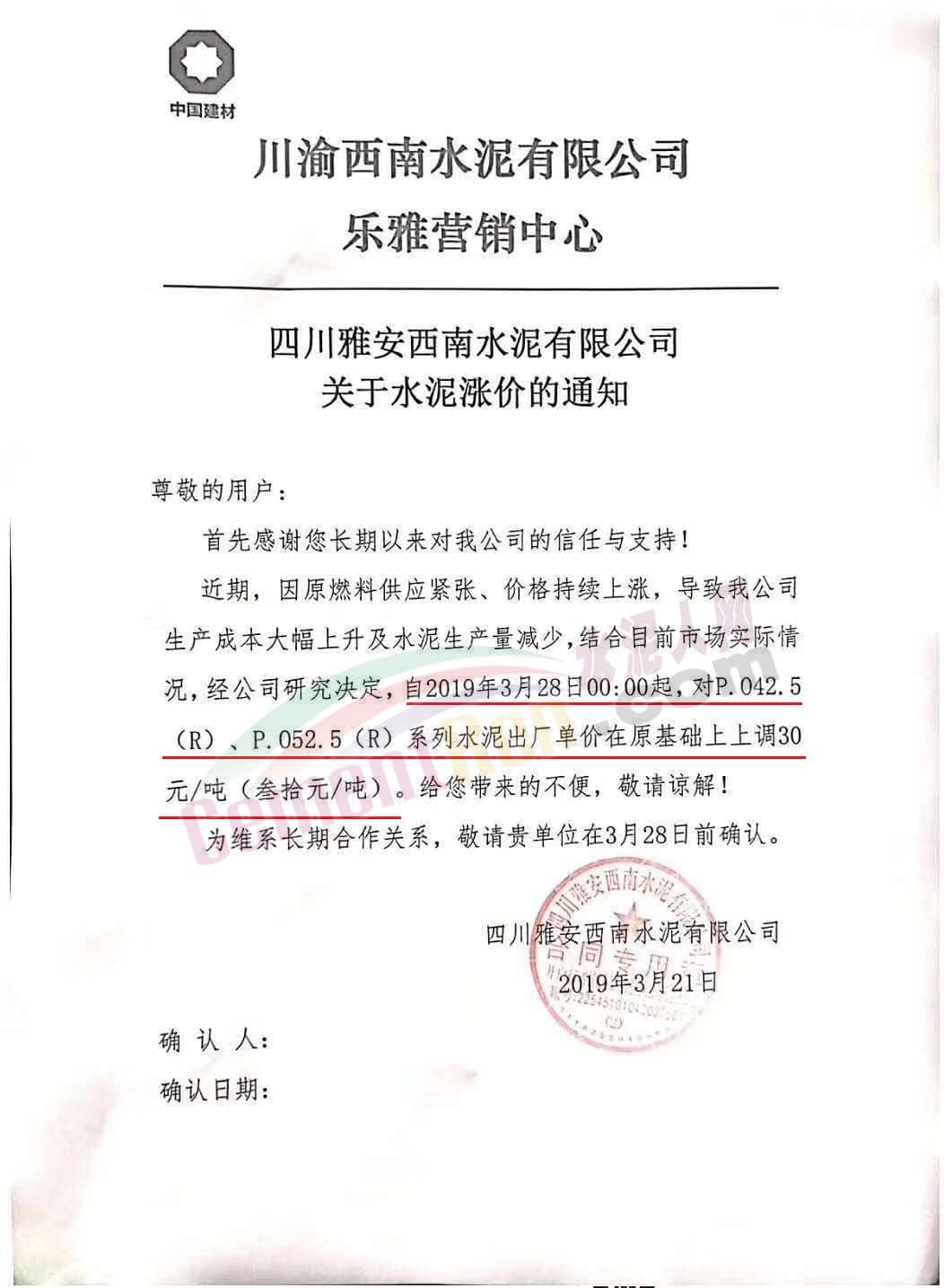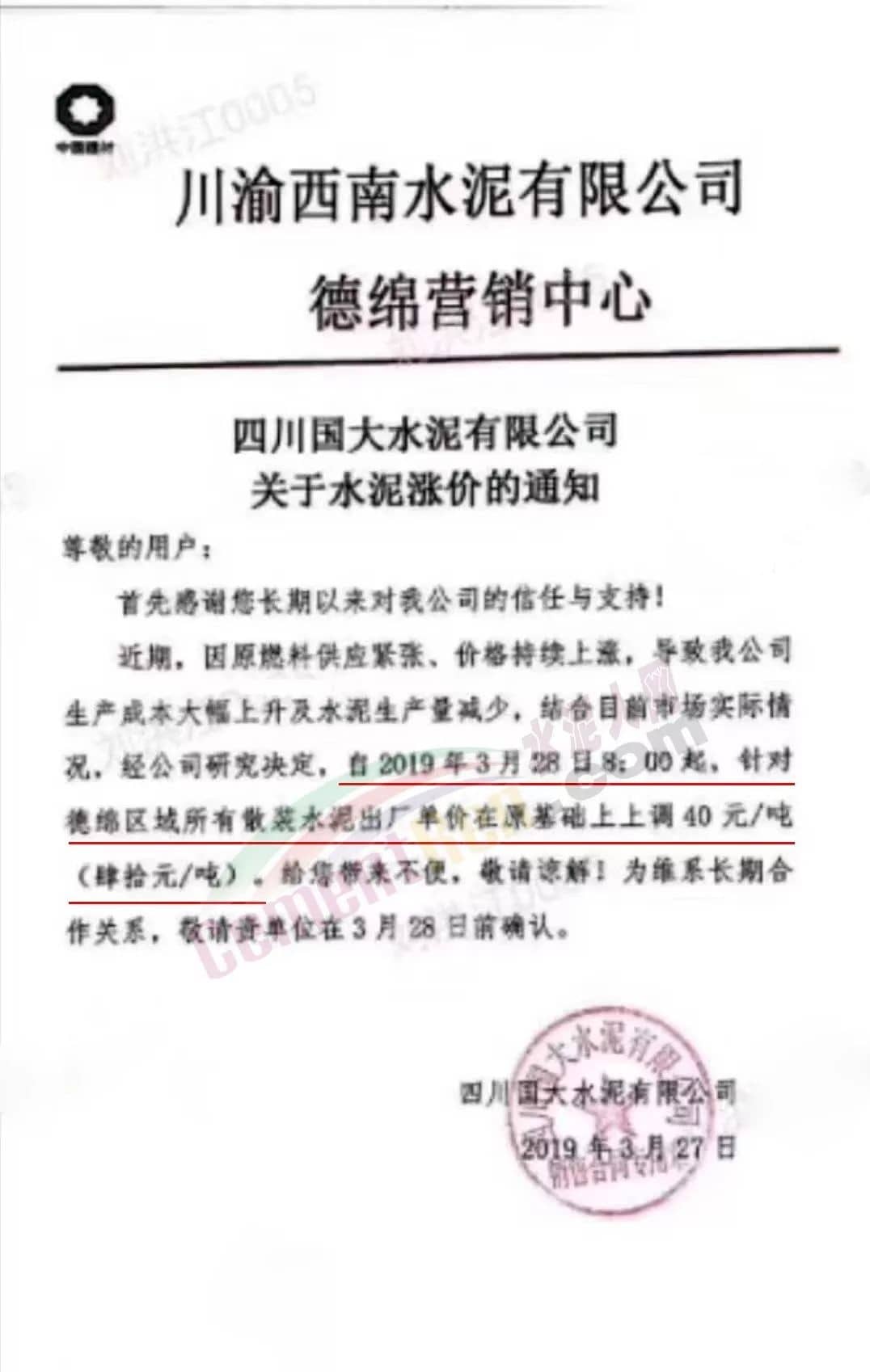 同期,川渝西南水泥旗下多個企業(yè)也通知自今日(3月有28日)起上調(diào)水泥價格。