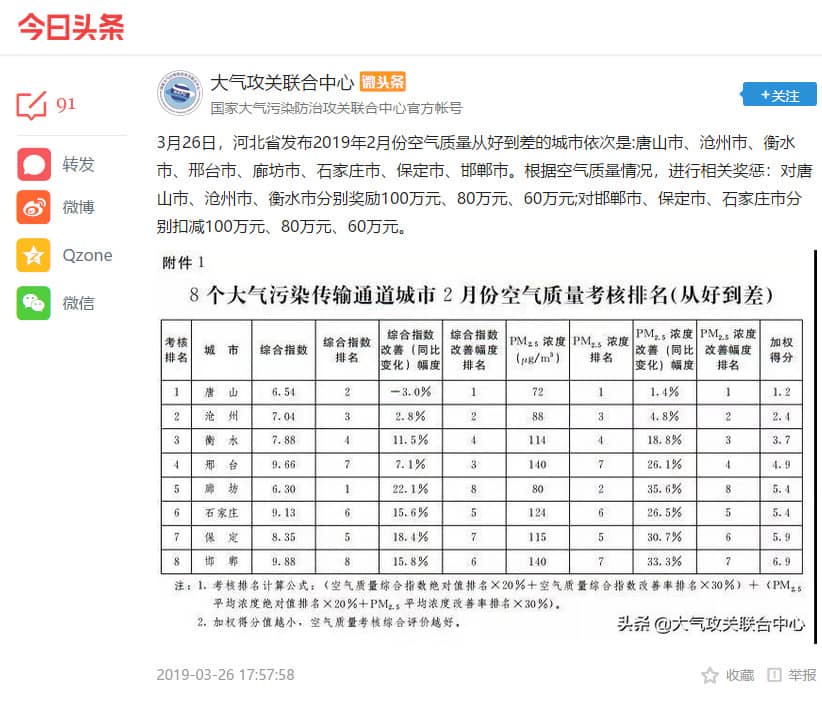 日前,國家大氣污染防治攻關聯(lián)合中心公布:3月26日,河北省發(fā)布2019年2月份空氣質量從好到差的城市依次是:唐山市、滄州市、衡水市、邢臺市、廊坊市、石家莊市、保定市、邯鄲市。根據(jù)空氣質量情況,進行相關獎懲:對唐山市、滄州市、衡水市分別獎勵100萬元、80萬元、60萬元;對邯鄲市、保定市、石家莊市分別扣減100萬元、80萬元、60萬元。