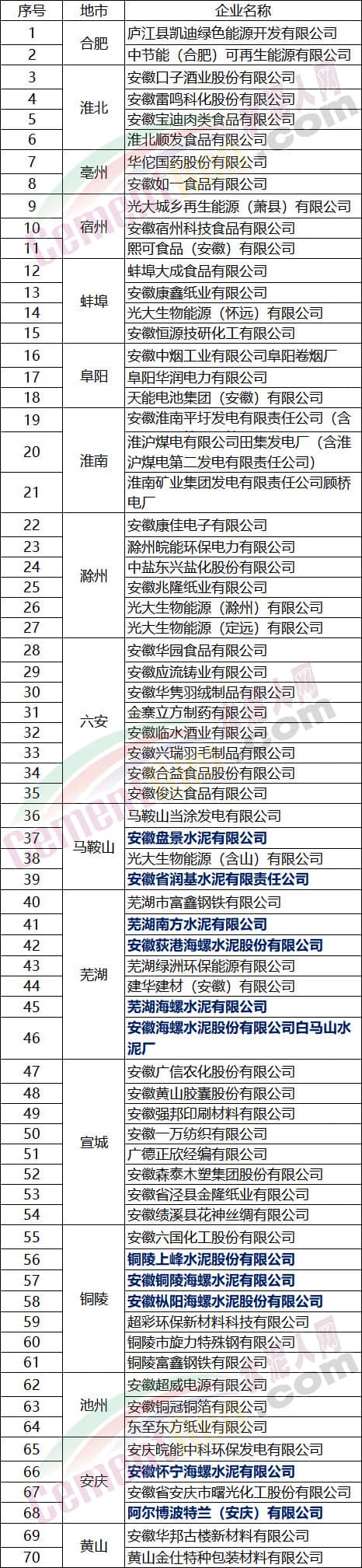 日前,水泥人網(wǎng)自安徽省經(jīng)濟(jì)和信息化廳了解到共有70家企業(yè)被評(píng)為2018年度省級(jí)節(jié)水型企業(yè)。其中水泥行業(yè)安徽荻港海螺水泥股份有限公司、蕪湖海螺水泥有限公司、安徽海螺水泥股份有限公司白馬山水泥廠、安徽銅陵海螺水泥有限公司、安徽樅陽(yáng)海螺水泥股份有限公司、安徽懷寧海螺水泥有限公司及安徽盤(pán)景水泥有限公司、安徽省潤(rùn)基水泥有限責(zé)任公司、銅陵上峰水泥股份有限公司、阿爾博波特蘭(安慶)有限公司也榜上有名。 安徽省經(jīng)濟(jì)和信息化廳名單公示原文如下: