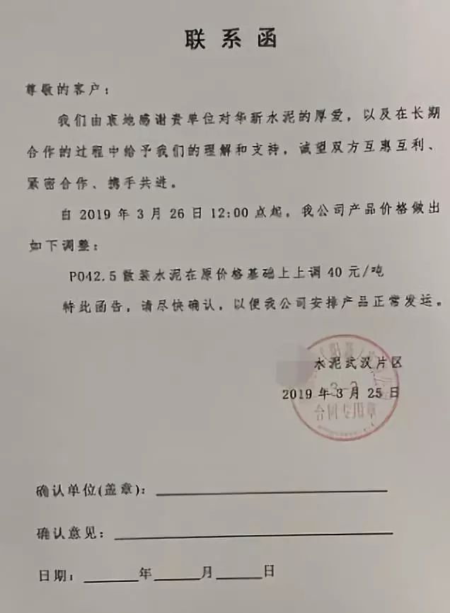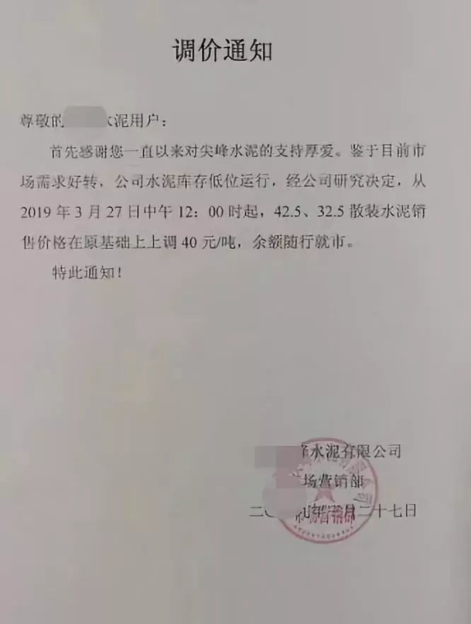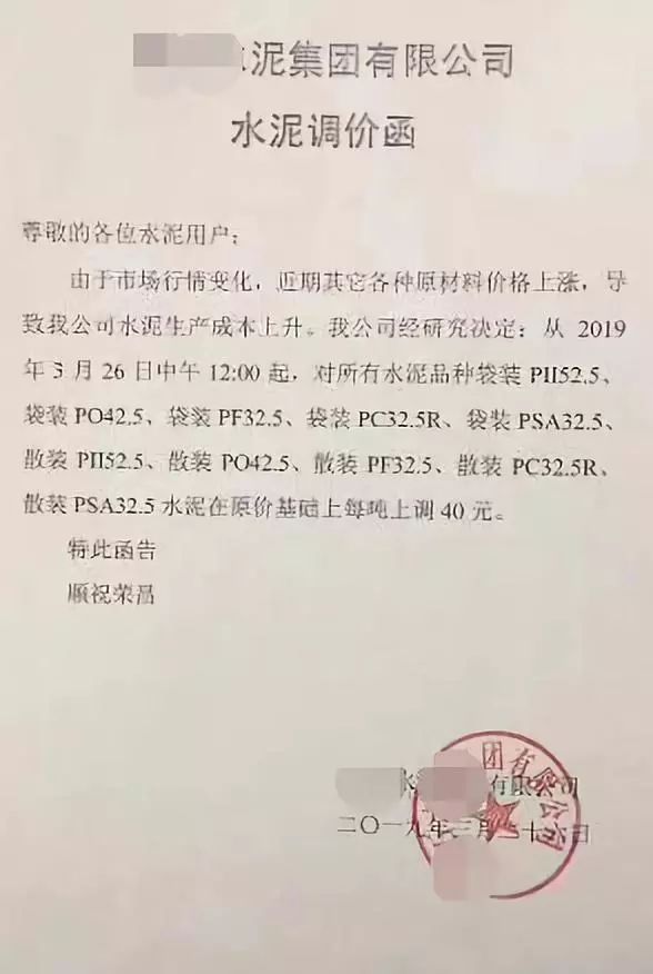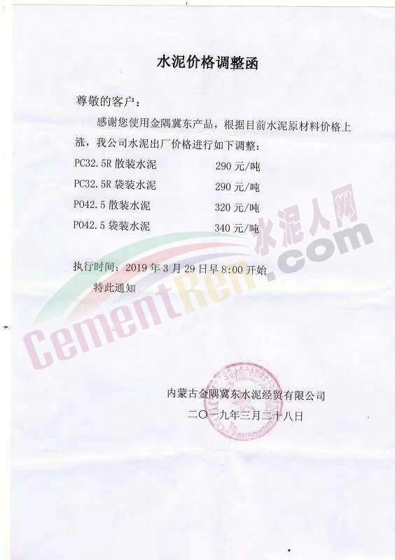 同期,內(nèi)蒙古金隅冀東水泥貿(mào)易有限公司也發(fā)函調(diào)整水泥價格。