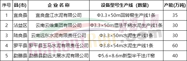 云南省2018年重點(diǎn)工業(yè)行業(yè)淘汰落后和壓減過剩產(chǎn)能完成情況公示名單中包含五家水泥企業(yè),淘汰產(chǎn)能共計(jì)195萬噸。淘汰產(chǎn)能詳情如下: