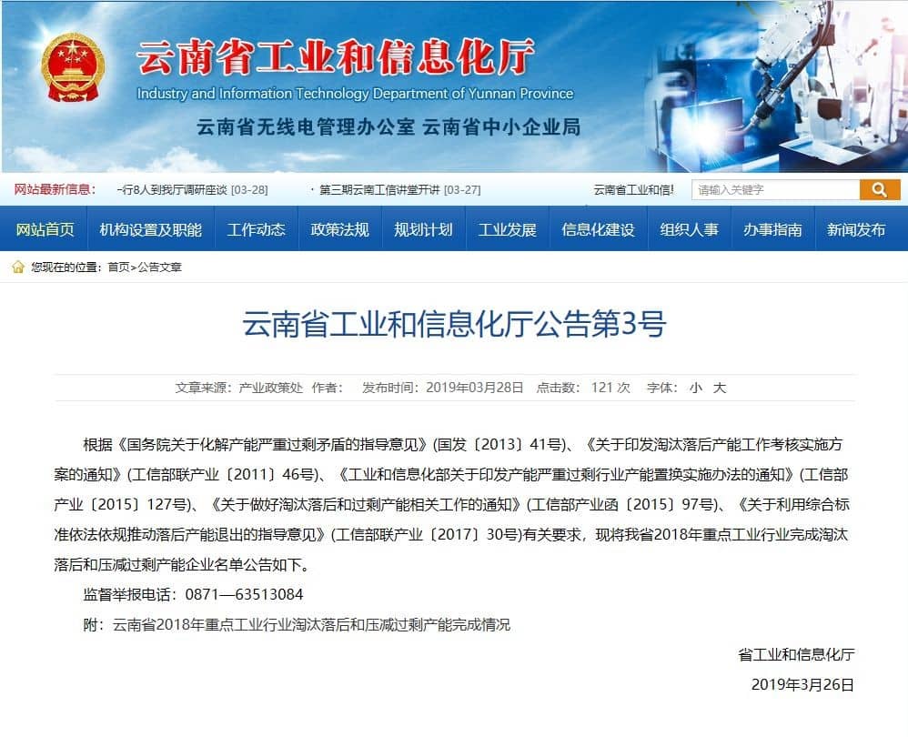 日前,云南省工信廳發(fā)布2019年第3號(hào)公告,公告稱根據(jù)《國(guó)務(wù)院關(guān)于化解產(chǎn)能嚴(yán)重過剩矛盾的指導(dǎo)意見》(國(guó)發(fā)〔2013〕41號(hào))、《關(guān)于印發(fā)淘汰落后產(chǎn)能工作考核實(shí)施方案的通知》(工信部聯(lián)產(chǎn)業(yè)〔2011〕46號(hào))、《工業(yè)和信息化部關(guān)于印發(fā)產(chǎn)能嚴(yán)重過剩行業(yè)產(chǎn)能置換實(shí)施辦法的通知》(工信部產(chǎn)業(yè)〔2015〕127號(hào))、《關(guān)于做好淘汰落后和過剩產(chǎn)能相關(guān)工作的通知》(工信部產(chǎn)業(yè)函〔2015〕97號(hào))、《關(guān)于利用綜合標(biāo)準(zhǔn)依法依規(guī)推動(dòng)落后產(chǎn)能退出的指導(dǎo)意見》(工信部聯(lián)產(chǎn)業(yè)〔2017〕30號(hào))有關(guān)要求,現(xiàn)將云南省2018年重點(diǎn)工業(yè)行業(yè)完成淘汰落后和壓減過剩產(chǎn)能企業(yè)名單予以公告,監(jiān)督舉報(bào)電話:0871—63513084。