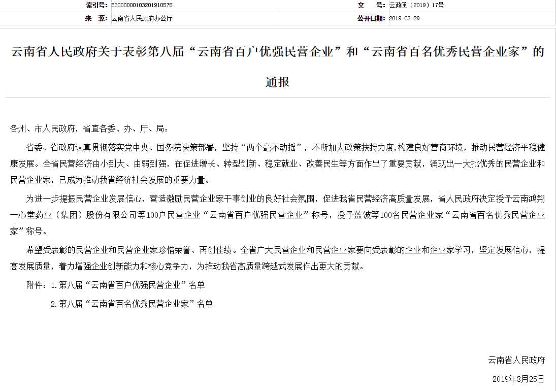 日前云南省人民政府發(fā)布《關(guān)于表彰第八屆“云南省百戶優(yōu)強民營企業(yè)”和“云南省百名優(yōu)秀民營企業(yè)家”的通報》稱為進一步提振民營企業(yè)發(fā)展信心,營造激勵民營企業(yè)家干事創(chuàng)業(yè)的良好社會氛圍,促進云南省民營經(jīng)濟高質(zhì)量發(fā)展,省人民政府決定授予云南鴻翔一心堂藥業(yè)(集團)股份有限公司等100戶民營企業(yè)“云南省百戶優(yōu)強民營企業(yè)”稱號,授予藍(lán)波等100名民營企業(yè)家“云南省百名優(yōu)秀民營企業(yè)家”稱號。