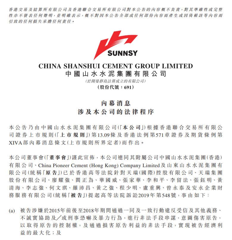 山水水泥(00691)公布,該公司連同其附屬公司中國山水水泥集團(tuán)(香港)有限公司、China Pioneer Cement(Hong Kong)Company Limited及山東山水水泥集團(tuán)有限公司(統(tǒng)稱原告)已于香港高等法院針對(duì)天瑞(國際)控股有限公司、天瑞集團(tuán)股份有限公司、廖耀強(qiáng)、閻正為、華國威、張家華、李和平、李留法、張鈺明、黃清海、李志強(qiáng)、何文琪、羅沛昌、黃之強(qiáng)、程少明、盧重興、曾永泰及安永企業(yè)財(cái)務(wù)服務(wù)有限公司(統(tǒng)稱被告)提起高等法院訴訟2019年第548號(hào)。