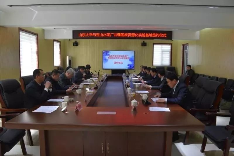 簽約儀式上,淄川區(qū)副區(qū)長趙軍致辭,對山東大學(xué)與寶山水泥共建固廢資源化實驗基地簽約表示祝賀,寶山水泥廠董事長賈木海介紹了企業(yè)情況,山東大學(xué)能源與動力工程學(xué)院黨委副書記滕玉軍介紹了山東大學(xué)能源與動力工程學(xué)院科研情況,董勇教授介紹了燃煤污染物減排國家工程實驗室情況,王文龍教授介紹了山東大學(xué)固廢資源化科研情況,毛巖鵬副教授介紹了固廢資源化實驗基地情況,隨后,與會人員一同觀看了淄博晨越寶山環(huán)??萍加邢薰纠盟喔G協(xié)同處置5萬噸/年固體廢物項目介紹PPT。
