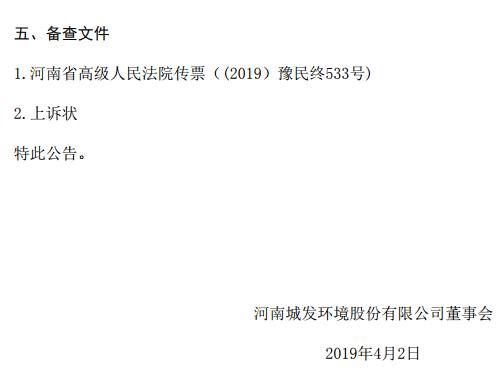 4月3日,河南城發(fā)環(huán)境股份有限公司(000885.SZ)發(fā)布(以下簡(jiǎn)稱城發(fā)環(huán)境)《重大訴訟公告》(以下簡(jiǎn)稱“公告”)。城發(fā)環(huán)境近日收到河南省高級(jí)人民法院送達(dá)的義馬煤業(yè)集團(tuán)股份有限公司(以下簡(jiǎn)稱義煤集團(tuán))對(duì)鄭州市中級(jí)人民法院(2018)豫01民初2479號(hào)民事判決的上訴狀和 (2019)豫民終533號(hào)案件傳票。