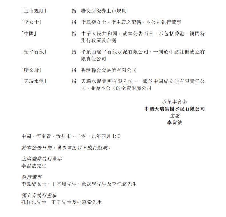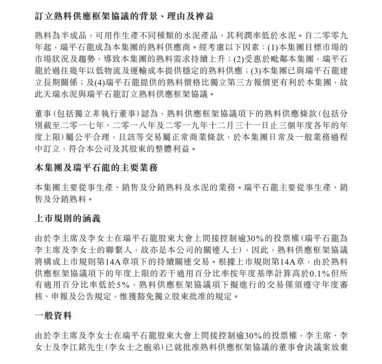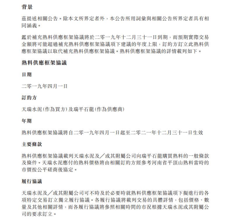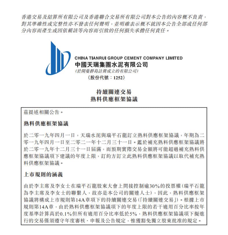 水泥人網(wǎng)網(wǎng)最新消息:中國(guó)天瑞水泥4月7日公布,2019年4月1日,天瑞水泥與瑞平石龍訂立熟料供應(yīng)框架協(xié)議,年期為2019年4月1日至2021年12月31日。
