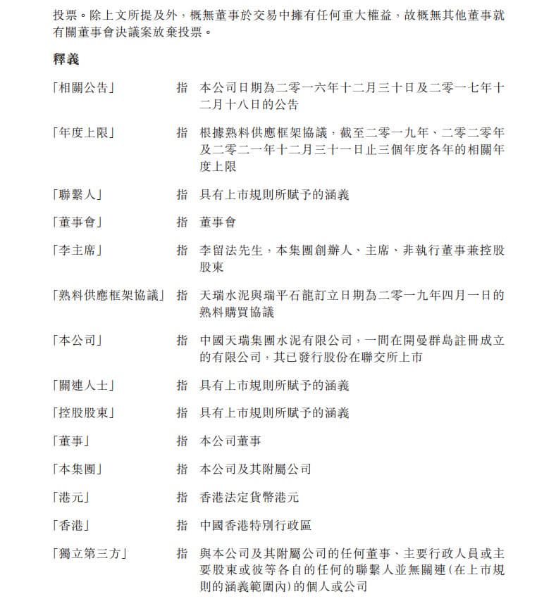 經(jīng)訂約方同意,截至2019年、2020年及2021年每年的12月31日止年度天瑞水泥就購(gòu)買(mǎi)熟料應(yīng)付瑞平石龍的最高年度總金額將不得超過(guò)人民幣5億元、5億元、5億元。
