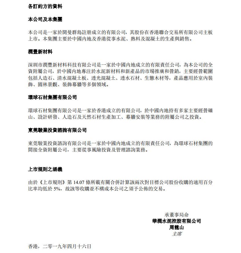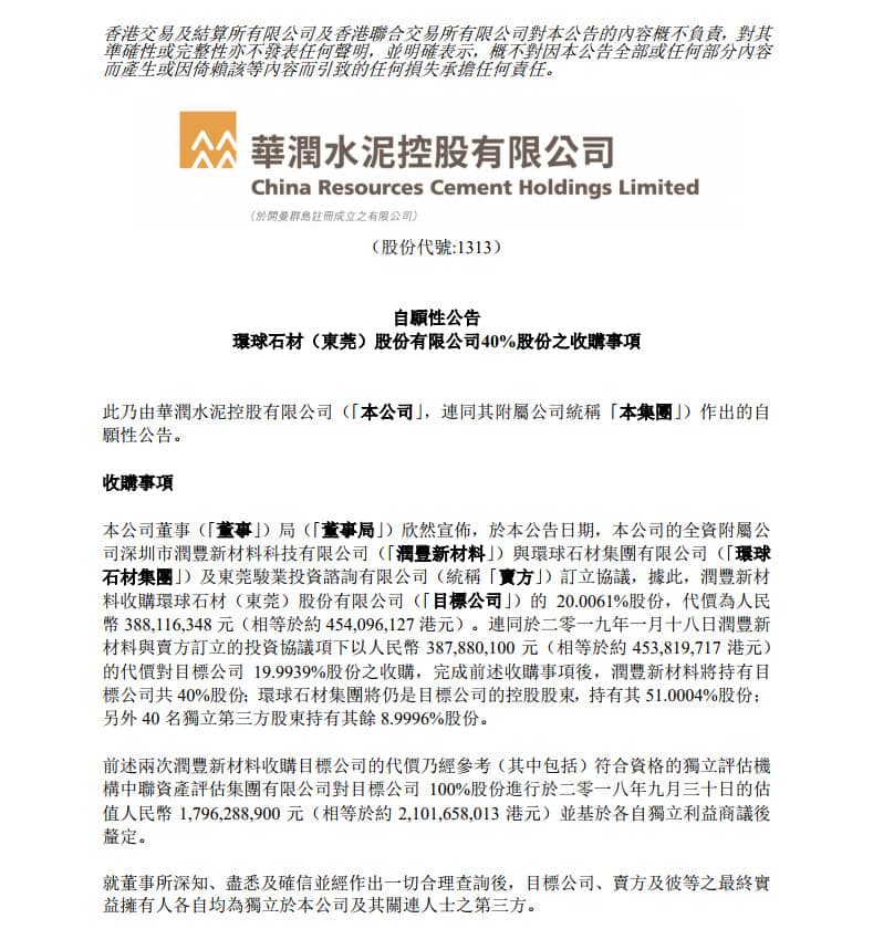 華潤水泥控股公告,該公司的全資附屬公司深圳市潤豐新材料科技有限公司與環(huán)球石材集團(tuán)有限公司及東莞駿業(yè)投資諮詢有限公司訂立協(xié)議,據(jù)此,潤豐新材料收購環(huán)球石材(東莞)股份有限公司(目標(biāo)公司)的20.0061%股份,代價為人民幣3.88億元。