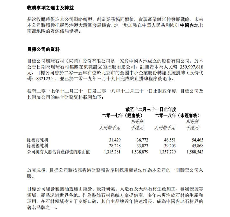 據(jù)悉,目標(biāo)公司環(huán)球石材(東莞)股份有限公司是一家于中國內(nèi)地成立的股份有限公司,于公告日期為環(huán)球石材集團(tuán)在東莞設(shè)立的控股附屬公司,注冊資為人民幣3.6億元,目標(biāo)公司曾于2015年在位于北京市的全國中小企業(yè)股份轉(zhuǎn)讓系統(tǒng)掛牌,并已于2019年3月19日完成終止掛牌程序后退市。