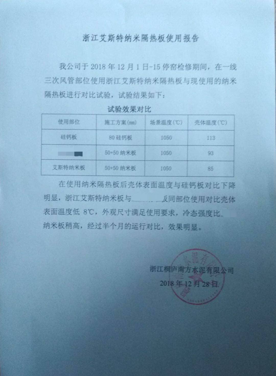 2018年以來,艾斯特納米隔熱材料在南方水泥和華新水泥等大型水泥集團(tuán)逐步推廣應(yīng)用,已得到客戶越來越多的肯定。納米隔熱材料的使用,給客戶帶來了非??捎^的經(jīng)濟(jì)效益。以浙江南方區(qū)域某水泥公司為例,使用效果和收益如下: