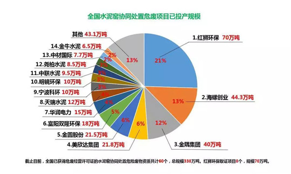以上為我國水泥窯協(xié)同處置項(xiàng)目分布及處置規(guī)模示意圖,因數(shù)據(jù)獲取渠道有限,個(gè)別企業(yè)數(shù)據(jù)會(huì)有出入,部分知名企業(yè)集團(tuán)項(xiàng)目數(shù)據(jù)不詳,暫列入其他,僅供讀者參考。