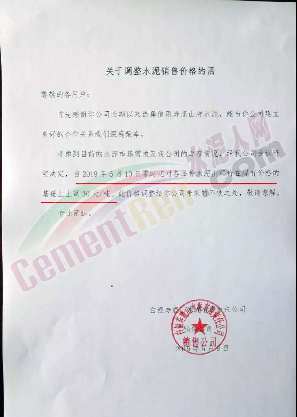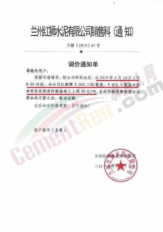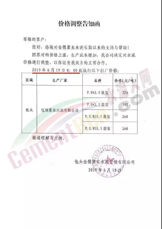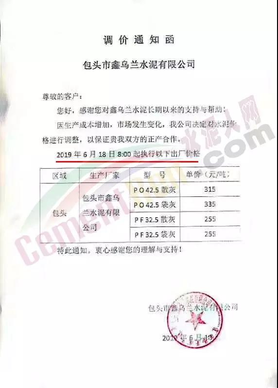 包頭市鑫烏蘭水泥有限公司調(diào)價(jià)通知在稱自2019年6月18日8時(shí)起執(zhí)行最新出廠價(jià)格。其中P.O42.5散灰執(zhí)行315元/噸。PF32.5袋灰執(zhí)行255元/噸。
