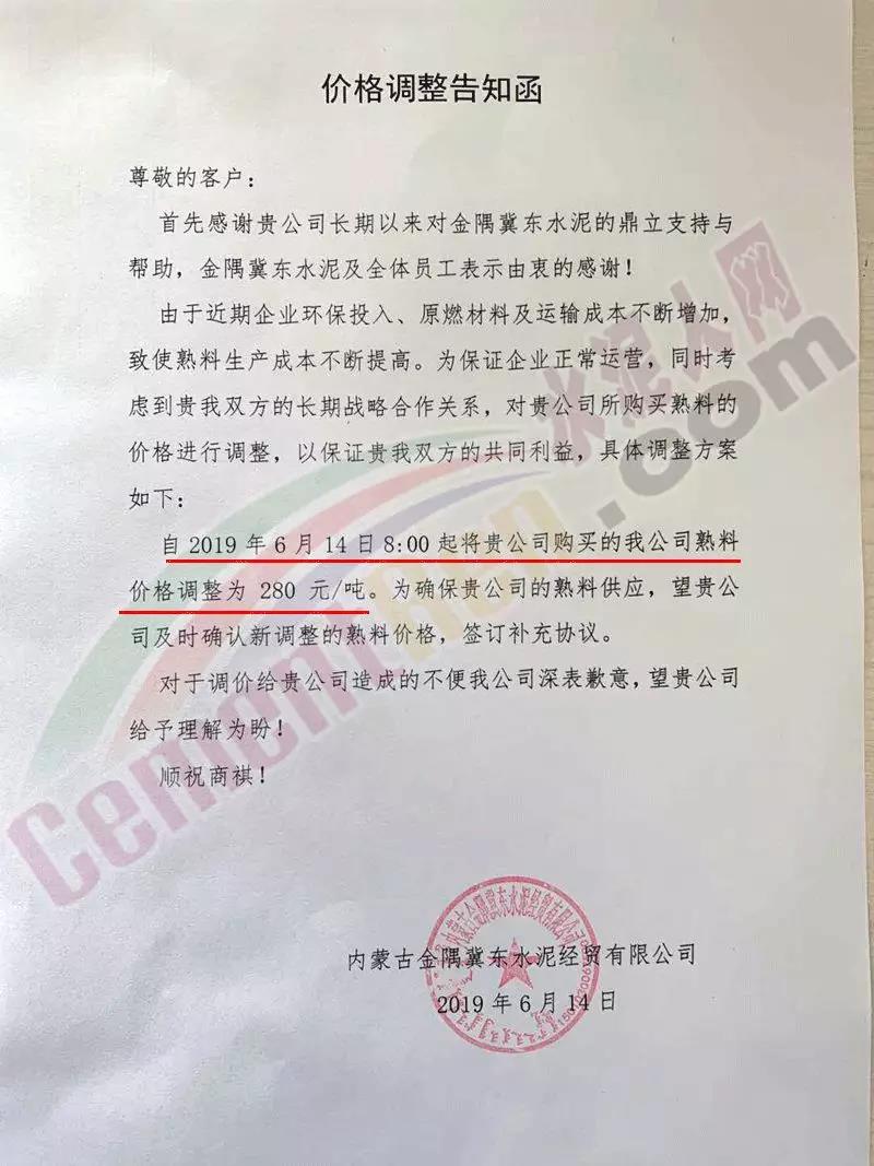 本月14日內(nèi)蒙古金隅冀東水泥經(jīng)貿(mào)有限公司發(fā)布價(jià)格調(diào)整告知函稱,由于近期企業(yè)環(huán)保投入、原燃材料成本不斷增加,致使熟料生產(chǎn)成本不斷提高。為保證企業(yè)正常運(yùn)營,同時(shí)考慮到雙方長期合作,對(duì)熟料價(jià)格進(jìn)行調(diào)整。自6月14日8點(diǎn)起熟料價(jià)格調(diào)整為280元/噸。