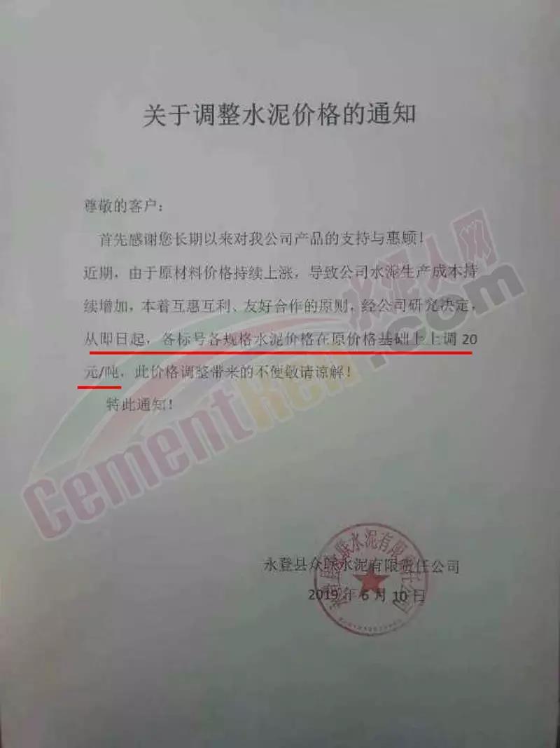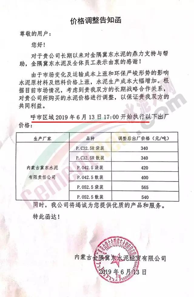 同期發(fā)布的水泥調(diào)價(jià)通知稱:根據(jù)目前市場(chǎng)情況 ,對(duì)水泥價(jià)格進(jìn)行調(diào)整,呼市區(qū)域自6月13日17:00開始執(zhí)行最新出廠價(jià)格。其中PC32.5R袋裝水泥調(diào)整后出廠價(jià)為340元/噸,PO42.5散裝水泥調(diào)整后出廠價(jià)為400元/噸,PO52.5散裝水泥出廠價(jià)540元/噸。