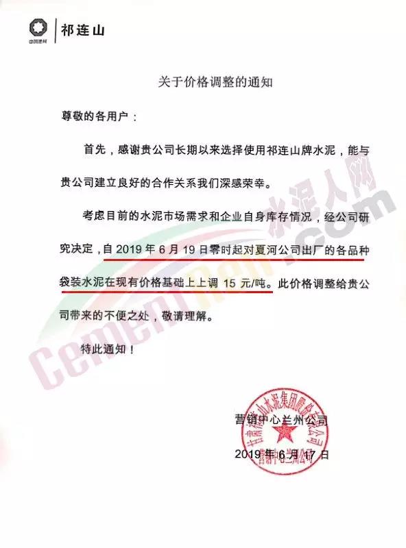 6月17日甘肅祁連山水泥營銷中心蘭州公司發(fā)布調(diào)價(jià)通知稱,考慮到目前的水泥市場(chǎng)和企業(yè)自身庫存情況,經(jīng)公司研究決定 ,自今日(6月19日)零時(shí)起對(duì)夏河公司出廠的各品種袋裝水泥在現(xiàn)有價(jià)格基礎(chǔ)上上調(diào)15元/噸。