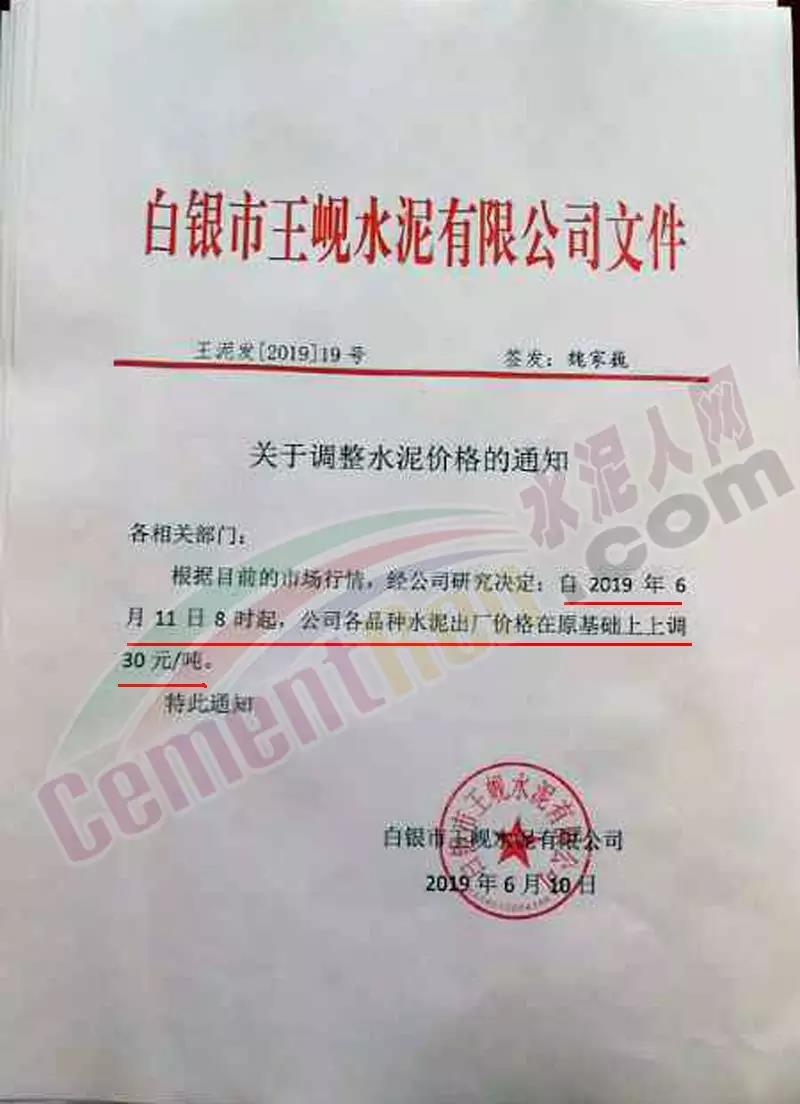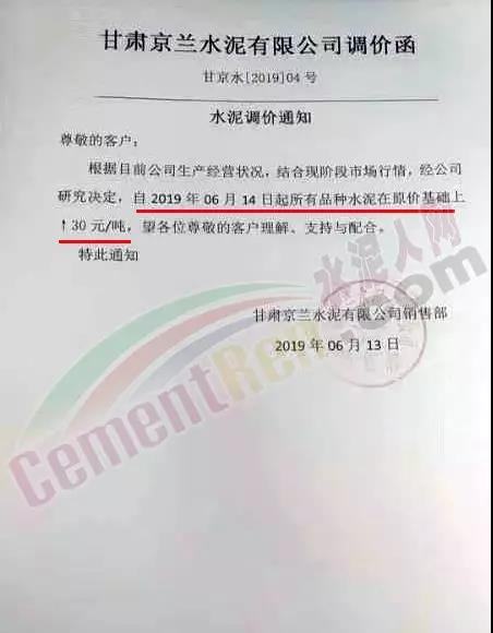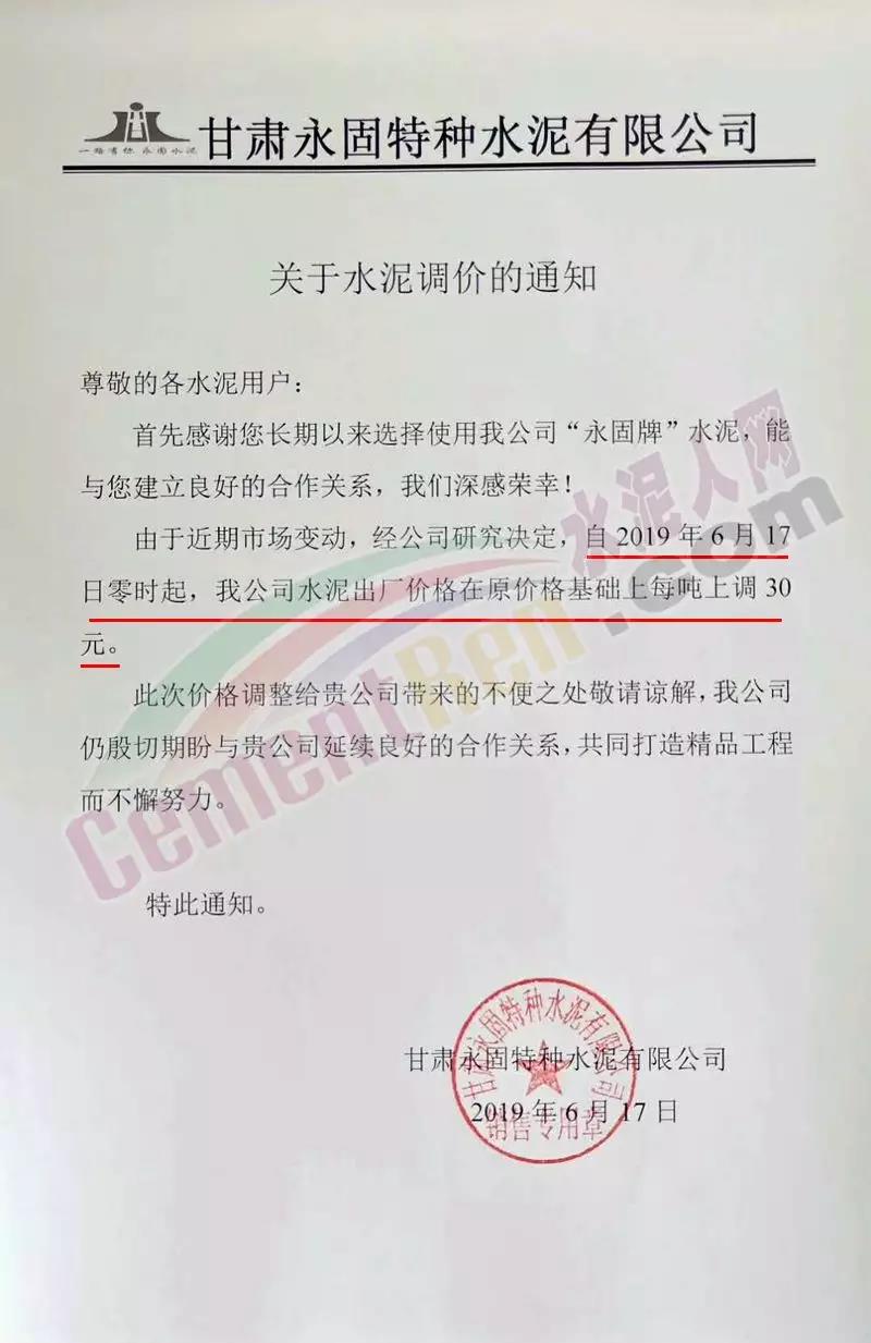 甘肅永固特種水泥有限公司自6月17日零時(shí)起,水泥出廠價(jià)格在原價(jià)格基礎(chǔ)上每噸上調(diào)30元。