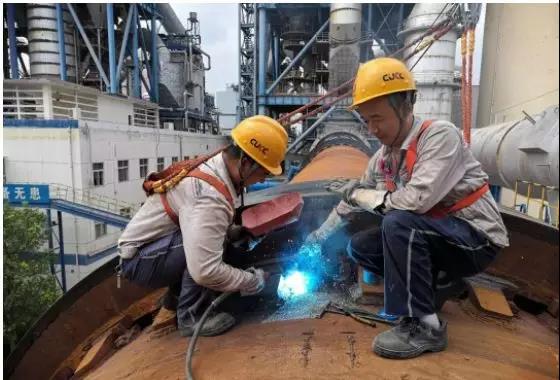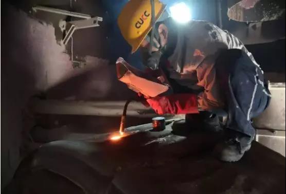 在2號(hào)生料立磨,機(jī)電車間維修班長(zhǎng)宋新奇正在對(duì)磨輥進(jìn)行手工堆焊,為節(jié)省檢修時(shí)間,提高效率,他和田強(qiáng)兩人換班作業(yè)。