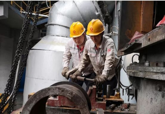 熟料車間維修班長(zhǎng)張世勇和巡檢工杜明博正在1號(hào)煤磨進(jìn)行設(shè)備檢修,此刻兩人正在對(duì)液壓缸軸承座進(jìn)行定位。