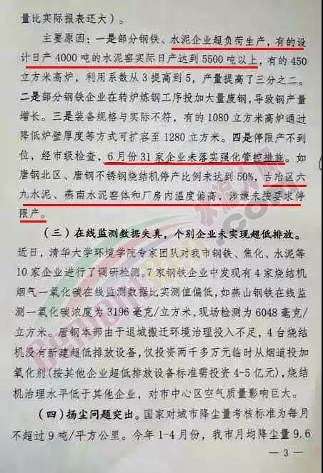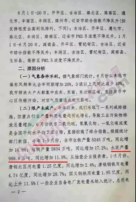 在空氣質(zhì)量不達(dá)標(biāo)的原因闡述中,限產(chǎn)未減產(chǎn)被視為一個(gè)重要方面。其中,部分鋼鐵、水泥企業(yè)超負(fù)荷生產(chǎn)。今年1-5月份,唐山市限產(chǎn)卻未減產(chǎn),水泥產(chǎn)量988.8萬(wàn)噸,同比增加11.9%。主要原因是部分水泥企業(yè)超負(fù)荷生產(chǎn),有的設(shè)計(jì)日產(chǎn)4000噸的水泥窯實(shí)際日產(chǎn)達(dá)到5500噸以上以及6月份古冶區(qū)六九水泥、燕南水泥窯體和廠房?jī)?nèi)溫度偏高,涉嫌未按要求停限產(chǎn)。