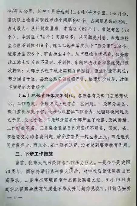 此外,文件指出,唐山市揚(yáng)塵問(wèn)題突出,1—5月份,省級(jí)以上檢查發(fā)現(xiàn)的揚(yáng)塵問(wèn)題有897個(gè),占問(wèn)題總數(shù)的39%。當(dāng)前,唐山市大氣污染防治工作壓力巨大。一是今年是建國(guó)70周年,國(guó)家將舉行系列重大活動(dòng),對(duì)空氣質(zhì)量保障提出更高要求。二是生態(tài)環(huán)境部高度重視,6月19日安排專門(mén)人員注意摸排重點(diǎn)行業(yè)產(chǎn)量、用電量和去產(chǎn)能情況。