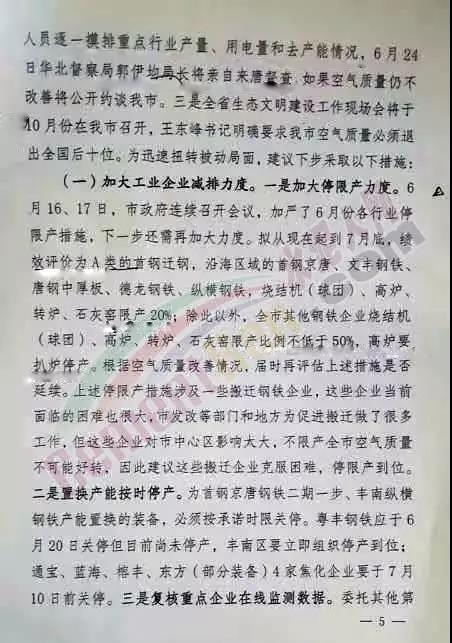 下一步,唐山市將加大工業(yè)企業(yè)減排力度。首先,加大停限產(chǎn)力度。擬從現(xiàn)在起到7月底,績(jī)效評(píng)價(jià)為A類的首鋼遷鋼,沿海區(qū)域的首鋼京唐、文豐鋼鐵、唐鋼中厚板、德龍鋼鐵、縱橫鋼鐵、燒結(jié)機(jī)(球團(tuán))、高爐、轉(zhuǎn)爐、石灰窯限產(chǎn)20%;除此以外,全是其他鋼鐵企業(yè)燒結(jié)機(jī)(球團(tuán))、高爐、轉(zhuǎn)爐、石灰窯限產(chǎn)比例不低于50%,高爐要扒爐停產(chǎn)。其次,置換產(chǎn)能按時(shí)停產(chǎn)。第三,復(fù)核重點(diǎn)企業(yè)在線監(jiān)測(cè)數(shù)據(jù)。文件原文如下: