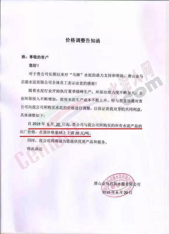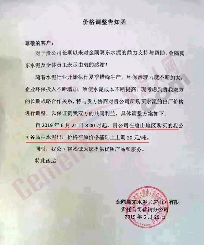 冀東水泥調(diào)價通知稱:隨著水泥行業(yè)開始執(zhí)行夏季錯峰生產(chǎn),環(huán)保治理力度不斷加大,企業(yè)環(huán)保投入不斷增加,致使水泥成本不斷提高。特與客戶協(xié)商對其購買水泥的出廠價格進行調(diào)整,以保證雙方共同利益。自6月21日8時起,在唐山地區(qū)購買的各品種水泥出廠價在原價格基礎(chǔ)上上調(diào)20元/噸。