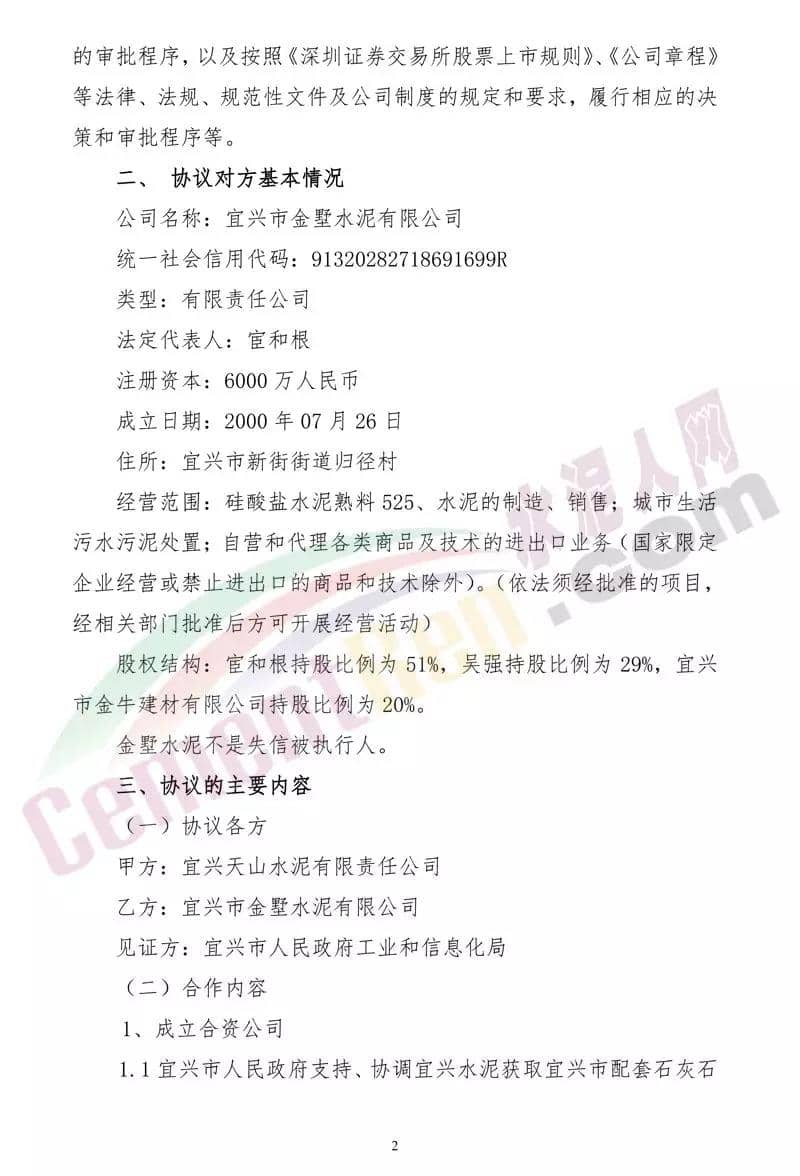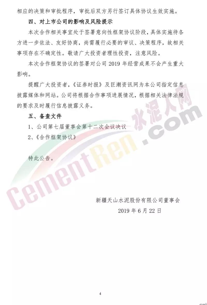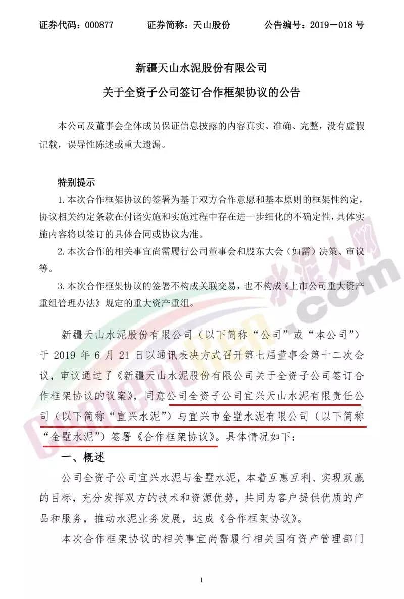 公告稱:新疆天山水泥股份有限公司于 2019 年 6 月 21 日以通訊表決方式召開(kāi)第七屆董事會(huì)第十二次會(huì)議,審議通過(guò)了《新疆天山水泥股份有限公司關(guān)于全資子公司簽訂合作框架協(xié)議的議案》,同意公司全資子公司宜興天山水泥有限責(zé)任公司(以下簡(jiǎn)稱“宜興水泥”)與宜興市金墅水泥有限公司(以下簡(jiǎn)稱“金墅水泥”)簽署《合作框架協(xié)議》。