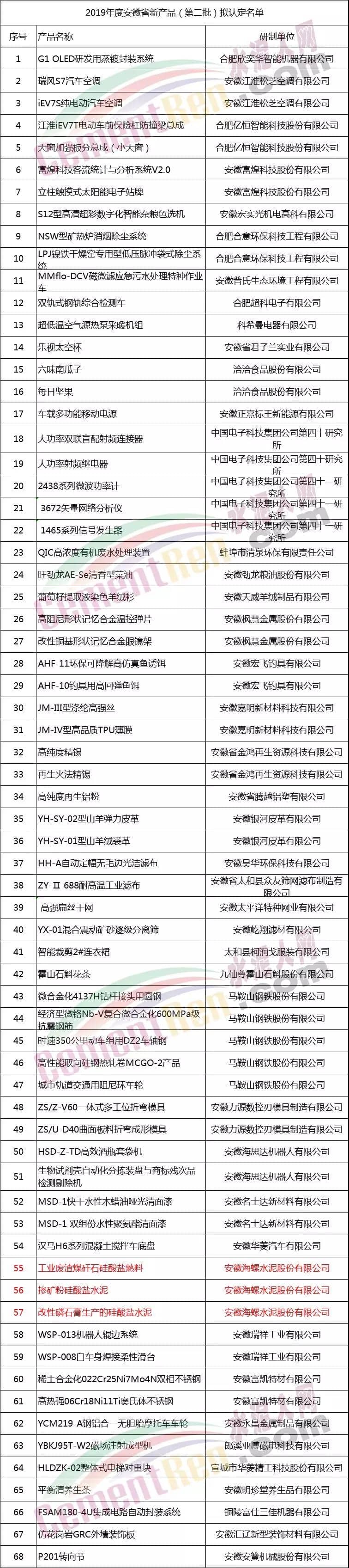 2019年度安徽省新產(chǎn)品(第二批)擬認定名單公示