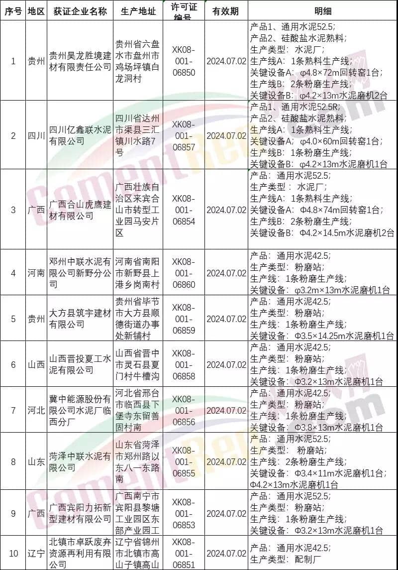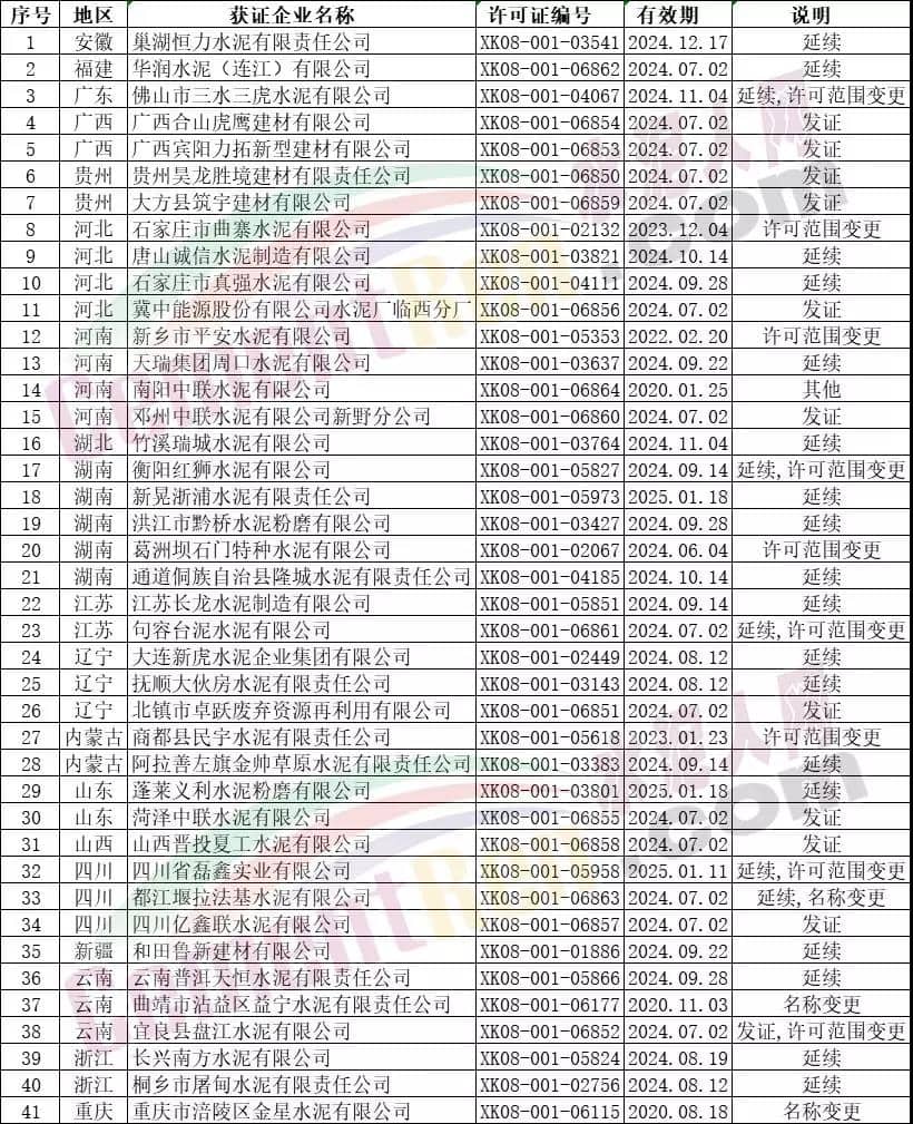 2019年7月第一批水泥企業(yè)生產(chǎn)許可證名單