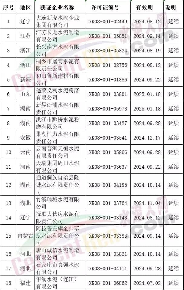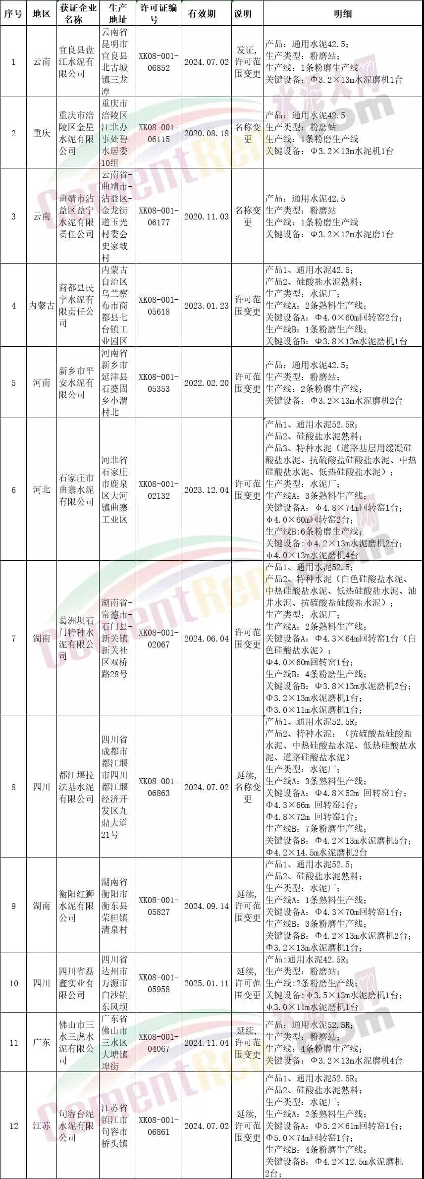 七月第一批發(fā)放證書涉及許可范圍、項目名稱變更的共12個編號,其中包括石家莊市曲寨水泥有限公司、葛洲壩石門特種水泥有限公司、都江堰拉法基水泥有限公司等多家生產(chǎn)特種水泥及通用52.5水泥產(chǎn)品的全能水泥廠;涉及生產(chǎn)許可證到期延續(xù)的企業(yè)共計18個編號。