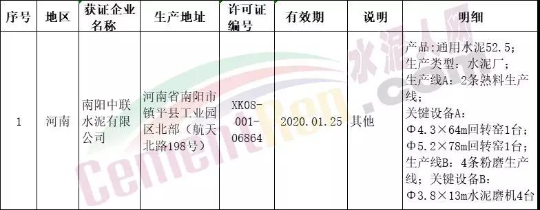 本期發(fā)放生產(chǎn)許可證的南陽中聯(lián)水泥有限公司生產(chǎn)地址位于河南省南陽市鎮(zhèn)平縣工業(yè)園區(qū)北部(航天北路198號)發(fā)證說明為“其他”。據(jù)水泥人網(wǎng)了解,南陽中聯(lián)水泥有限公司2018年12月29日舉行了揭牌儀式,中國聯(lián)合水泥集團有限公司南陽分公司正式變更為具有獨立法人資格的南陽中聯(lián)水泥有限公司。國家市場監(jiān)管總局七月第一批生產(chǎn)許可證發(fā)放詳情如下:
