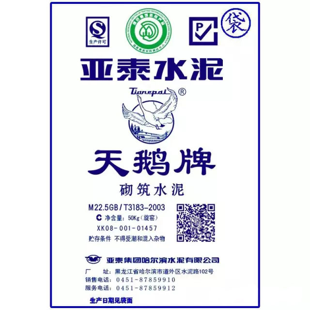 1、“天鵝”牌M22.5水泥包裝袋質(zhì)量符合GB9774-2010標(biāo)準(zhǔn),標(biāo)識(shí)齊全,袋面有工廠名稱、廠址、生產(chǎn)許可證編號(hào)、水泥名稱(砌筑水泥)、注冊(cè)商標(biāo)、標(biāo)號(hào)(M22.5)、水泥出廠時(shí)間、編號(hào)(整齊的機(jī)器噴碼),請(qǐng)?jiān)谫?gòu)買時(shí)加以檢驗(yàn)。
