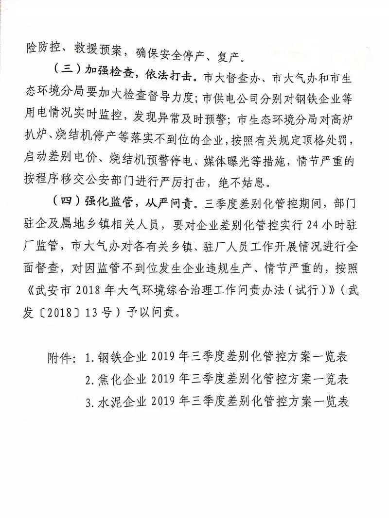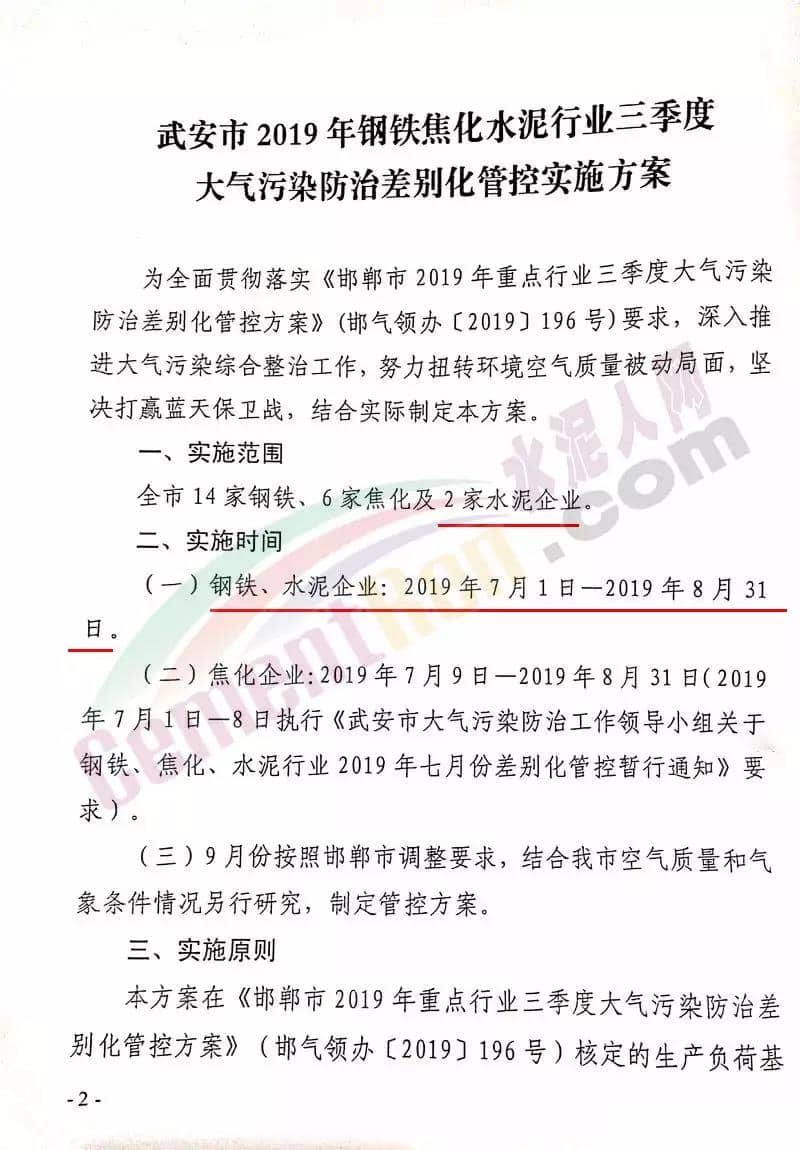 水泥人網(wǎng)消息:7月8日,武安市政府印發(fā)《武安市2019年鋼鐵焦化水泥行業(yè)三季度大氣污染防治差別化管控實(shí)施方案》的通知。要求在7月1日-8月31日期間,全市14家鋼鐵、6家焦化及2家水泥企業(yè)按照要求執(zhí)行錯(cuò)峰停產(chǎn)政策,9月份結(jié)合本市的空氣質(zhì)量和氣象條件再另行制定管控方案。方案原文如下: