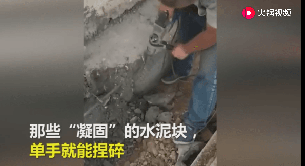 7月9日,鹿邑縣志成實(shí)驗(yàn)學(xué)校校長(zhǎng)張光啟對(duì)記者出示了工人清除問題水泥時(shí)的視頻。那些“凝固”的水泥塊,單手就能捏碎。為了把那些劣質(zhì)水泥清除干凈,“后期工人們是用手一塊一塊把水泥摳下來的”。