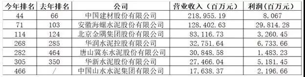在500強(qiáng)排行榜中水泥行業(yè)上榜的企業(yè)有七家,分別為:中國(guó)建材股份有限公司、安徽海螺水泥股份有限公司、北京金隅集團(tuán)股份有限公司、華潤(rùn)水泥控股有限公司、唐山冀東水泥股份有限公司、華新水泥股份有限公司、中國(guó)山水水泥集團(tuán)有限公司。