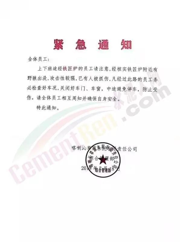 昨日(18日)喀喇沁草原水泥有限責(zé)任公司發(fā)布緊急通知給全體員工稱,上下班途經(jīng)鐵匠爐的員工需注意,經(jīng)核實(shí)鐵匠爐附近有野狼出沒,攻擊性較強(qiáng),已有人被抓傷,凡經(jīng)過此路的員工務(wù)必檢查好車況,關(guān)閉好車門、車窗,中途避免停車,防止受傷。請(qǐng)全體員工相互周知并確保自身安全。