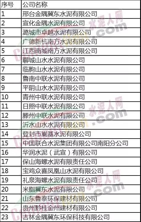 本次公布的綠色工廠名單當(dāng)中,包括邢臺金隅冀東水泥有限公司、廣德新杭南方水泥有限公司、聊城山水水泥有限公司、青州中聯(lián)水泥有限公司、保山海螺水泥有限責(zé)任公司、華潤水泥(武宣)有限公司等23家水泥企業(yè),具體名單如下: