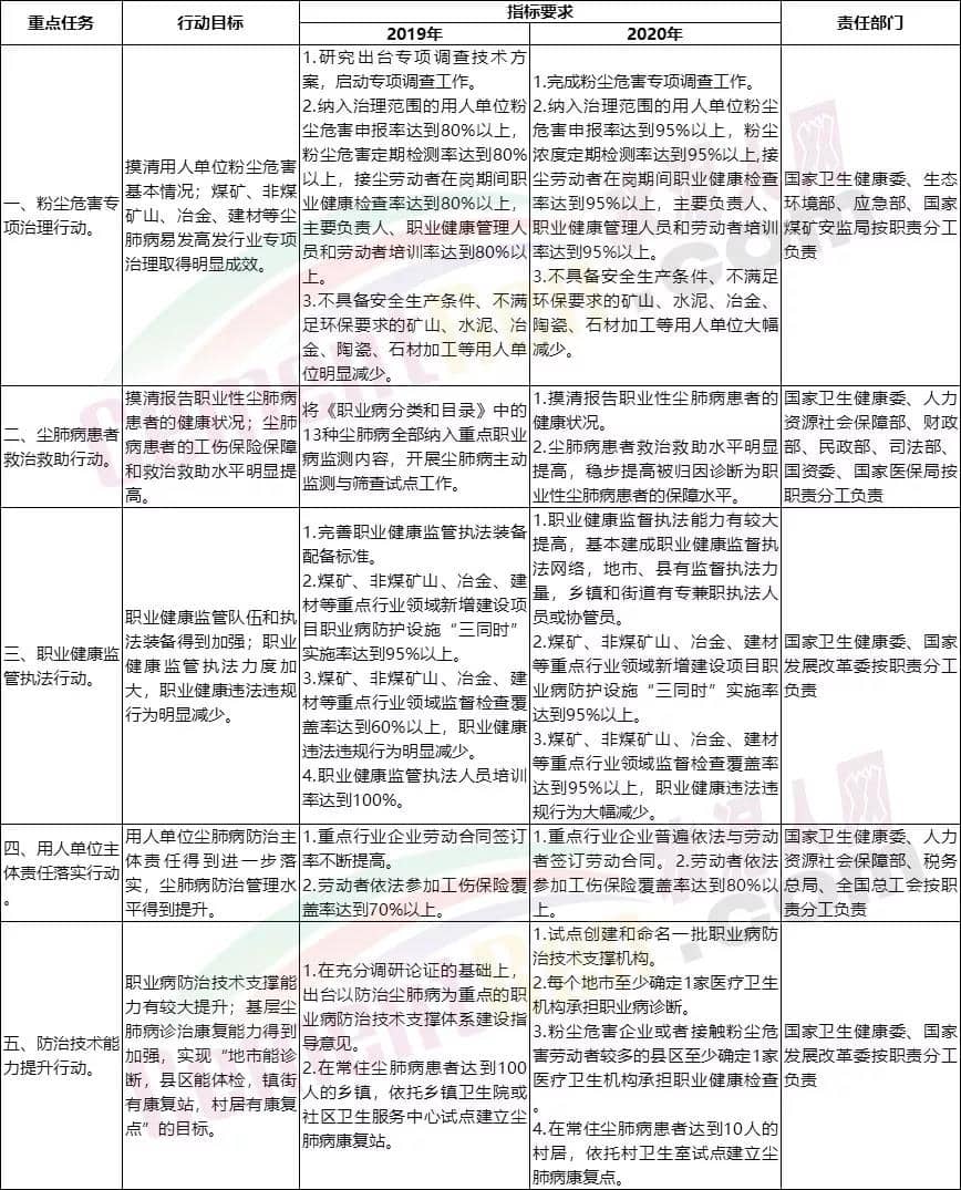 為貫徹落實黨中央、國務(wù)院領(lǐng)導(dǎo)同志重要批示精神和《國家職業(yè)病防治規(guī)劃(2016-2020年)》有關(guān)要求,解決當前塵肺病防治工作中存在的重點和難點問題,堅決遏制塵肺病高發(fā)勢頭,保障勞動者職業(yè)健康權(quán)益,特制定本行動方案。
