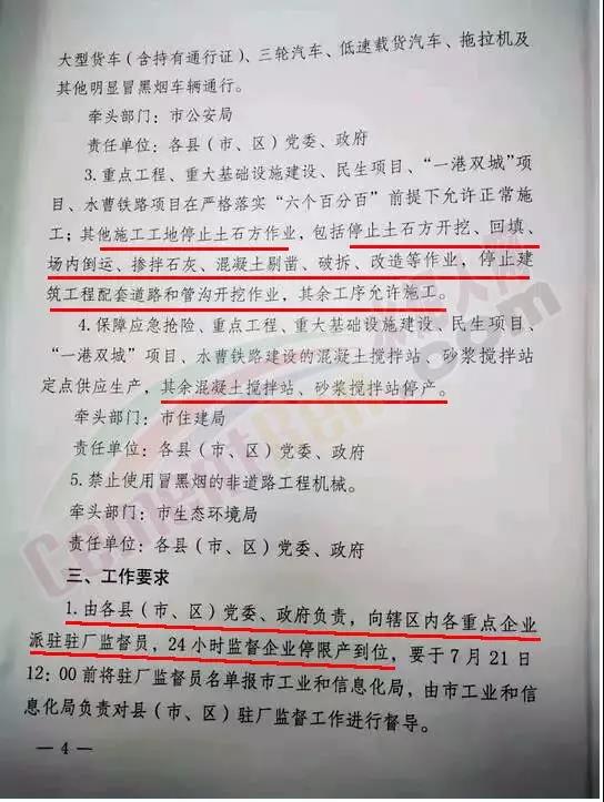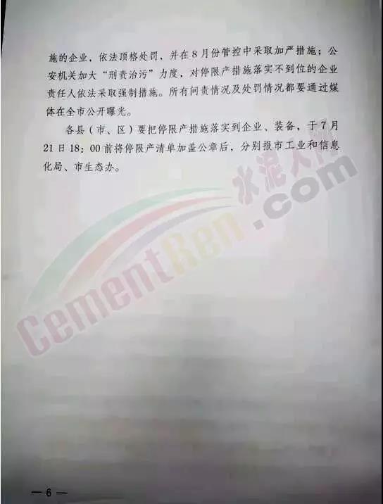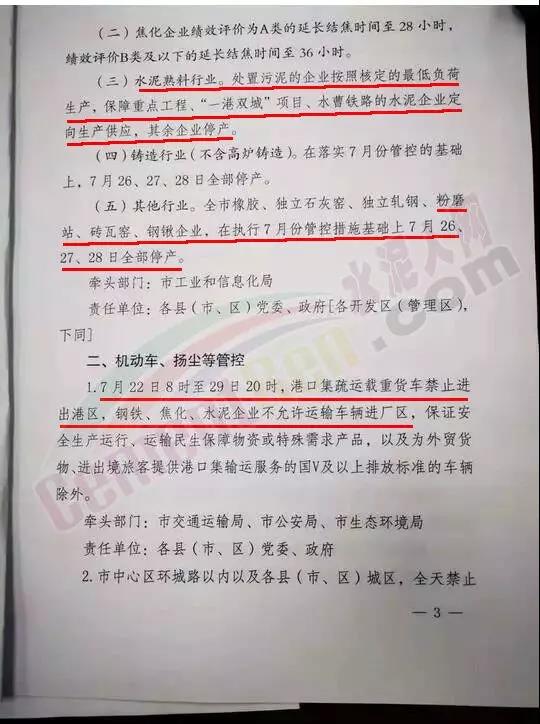 處置污泥的企業(yè)按照核定的最低負(fù)荷生產(chǎn),保障重點工程、“一港雙城”項目、水曹鐵路的水泥企業(yè)定向生產(chǎn)供應(yīng),其余企業(yè)停產(chǎn);他行業(yè)。全市粉磨站、磚瓦窯、鋼鍬等企業(yè),在執(zhí)行7月份管控措施基礎(chǔ)上7月26、27、28日全部停產(chǎn)。