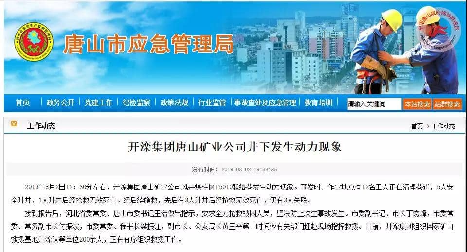 昨日(8月2日)唐山市應(yīng)急管理局發(fā)布消息稱:2019年8月2日12:30分左右,開(kāi)灤集團(tuán)唐山礦業(yè)公司風(fēng)井煤柱區(qū)F5010聯(lián)絡(luò)巷發(fā)生動(dòng)力現(xiàn)象。事發(fā)時(shí),作業(yè)地點(diǎn)有12名工人正在清理巷道,5人安全升井,1人升井后經(jīng)搶救無(wú)效死亡。經(jīng)后續(xù)施救,先后有3人升井后經(jīng)搶救無(wú)效死亡,仍有3人失聯(lián)。