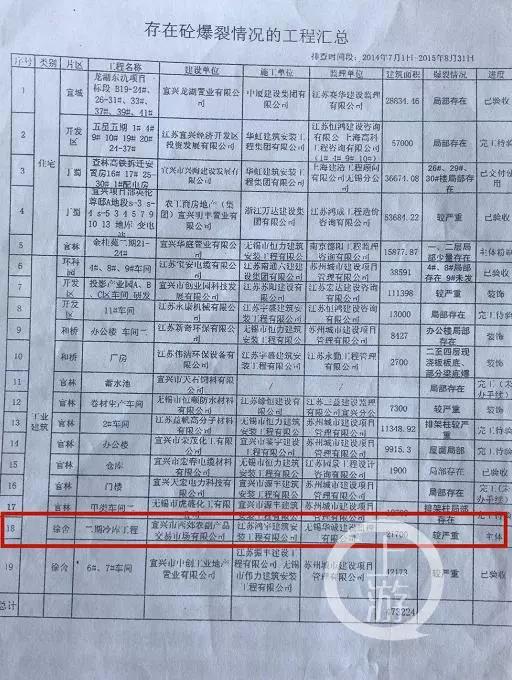 19個項(xiàng)目中,西郊農(nóng)副產(chǎn)品交易市場屬較為嚴(yán)重情形。受訪者供圖,三木建材簽約時(shí)疑無生產(chǎn)資質(zhì)此外,記者梳理發(fā)現(xiàn),19個項(xiàng)目中還涉及5處住宅項(xiàng)目,其中一處為拆遷安置房。目前除西郊農(nóng)副產(chǎn)品交易市場外,大部分項(xiàng)目已通過修復(fù)、退房等方式解決了遺留問題。另外,記者注意到,宜興市三木建材有限公司與江蘇鴻宇建筑安裝工程有限公司合同簽訂時(shí)間為2014年9月23日,但在宜興市住建局建設(shè)工程質(zhì)量監(jiān)督站提供的由無錫市建設(shè)局發(fā)放的《建筑業(yè)企業(yè)資質(zhì)證書》上卻標(biāo)注,宜興市三木建材有的公司取得生產(chǎn)資質(zhì)的時(shí)間為2014年10月24日。對此,宜興市住建局建設(shè)工程質(zhì)量監(jiān)督站相關(guān)負(fù)責(zé)人程冰表示,在此之前宜興市三木建材有限公司是有預(yù)生產(chǎn)資格的。一般對混凝土檢測只是根據(jù)國家規(guī)定進(jìn)行強(qiáng)度測試,多次檢測過程中均顯示合格,且目前國家并無混凝土中不允許摻雜鋼渣的規(guī)定。“當(dāng)時(shí)該企業(yè)給我們上報(bào)成分時(shí)并未標(biāo)注有鋼渣成分,而且據(jù)我們調(diào)查,企業(yè)不是在所有批次中均添加鋼渣。且由于鋼渣中存在游離成分,放置時(shí)間長的也就揮發(fā)掉了,沒有揮發(fā)的游離成分被添加在混泥土中,遇水則發(fā)生了氧化反應(yīng)。其氧化和爆裂的時(shí)間也是無法確定的。”程冰解釋。而對于為何在混凝土中添加鋼渣,此前,宜興三木建材有限公司負(fù)責(zé)人繆幸福在接受媒體采訪時(shí)稱,28天的石塊反應(yīng)期內(nèi)并沒有出現(xiàn)過爆裂現(xiàn)象。在混凝土中添加廢鋼渣是不少混凝土企業(yè)的常用手法,且其發(fā)現(xiàn)將廢鋼渣添加到混凝土中后會增加其硬度,因此才將廢鋼渣當(dāng)做粗骨料與石子一起添加到混凝土中使用。而對于出現(xiàn)問題后如何處理,繆幸福稱還在等待權(quán)威部門的鑒定結(jié)果,而這一等就是4年時(shí)間。