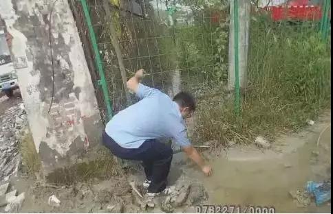由于某路段正在施工,執(zhí)法人員便下車步行。走至路邊,突然發(fā)現(xiàn)有流水和灰白色淤泥從一墻邊水溝緩緩流出。起初,執(zhí)法人員以為是施工泥漿,但是出于職業(yè)敏感想上去查個(gè)究竟,沒想到一腳陷入泥里。