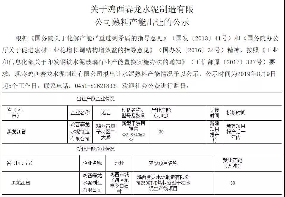 公示文件中提到的產(chǎn)能出讓企業(yè)雞西賽龍水泥制造有限公司位于黑龍江雞西市城子河區(qū)二太堡的熟料產(chǎn)能30萬(wàn)噸/年(新型干法回轉(zhuǎn)窯Φ2.8×40m×2)。受讓產(chǎn)能企業(yè)為位于雞西市城子河區(qū)永豐鄉(xiāng)白石村雞西賽龍水泥制造有限公司的2500T/D熟料新型干法水泥生產(chǎn)線項(xiàng)目。