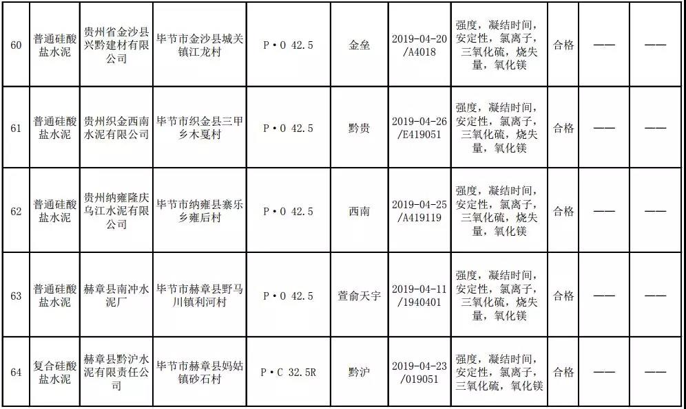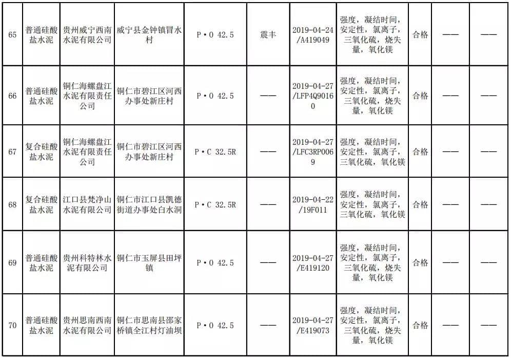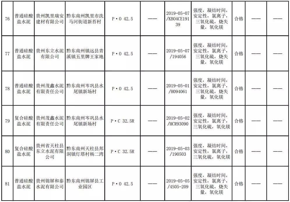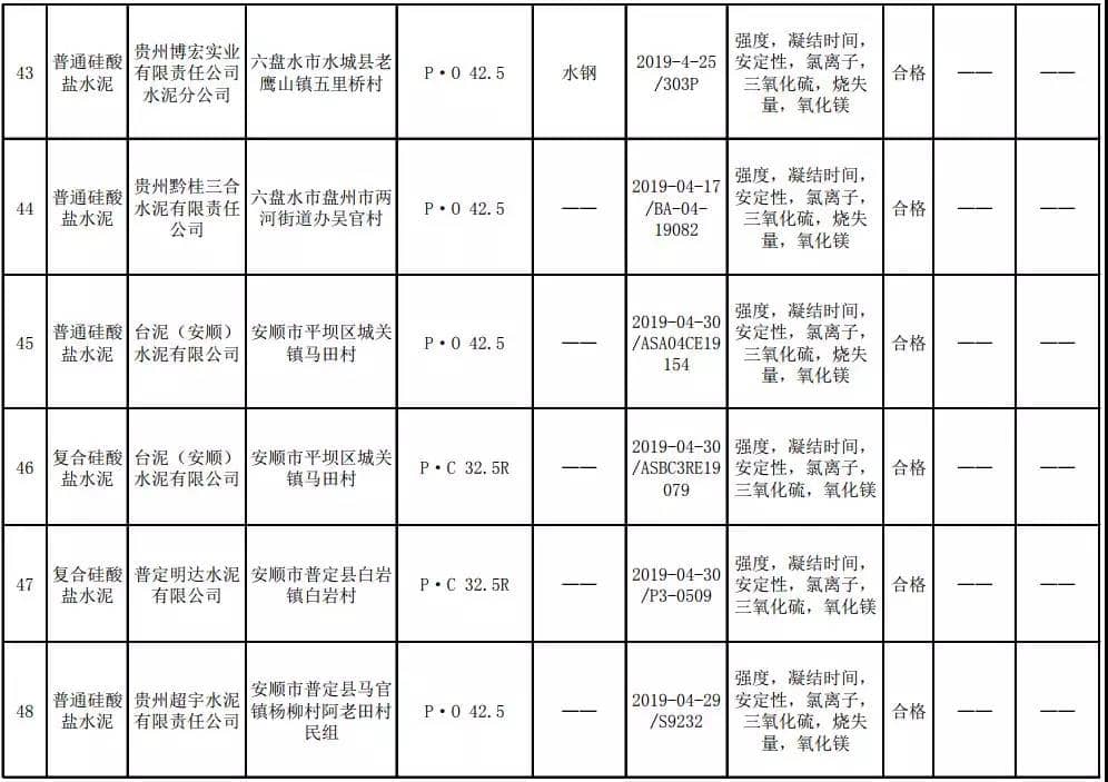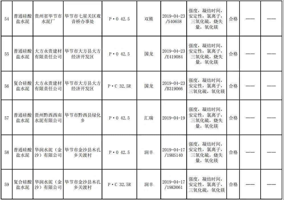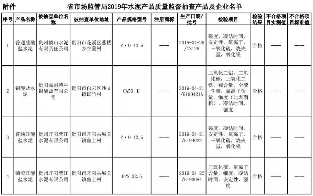 2019年8月13日,貴州省市場(chǎng)監(jiān)督管理局網(wǎng)站公布2019年水泥產(chǎn)品質(zhì)量監(jiān)督抽查結(jié)果。本次監(jiān)督抽查共抽查90家企業(yè)生產(chǎn)的112批次產(chǎn)品,抽查區(qū)域涉及貴陽(yáng)市、遵義市、六盤(pán)水市、安順市、畢節(jié)市、銅仁市、黔東南州、黔南州、黔西南州,產(chǎn)品檢驗(yàn)結(jié)果均為合格,問(wèn)題產(chǎn)品檢出率為0%,問(wèn)題企業(yè)發(fā)現(xiàn)率為0%。
