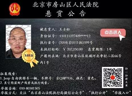 房山法院發(fā)布的另一起因不履行民間借貸糾紛案件判決結(jié)果而發(fā)布的懸賞公告, 被執(zhí)行人王士松,44歲,家住北京市房山區(qū)琉璃河北章村二區(qū)66號(hào)內(nèi)1號(hào)。其因“手頭緊”向朋友借款20萬(wàn)元后不再歸還,被朋友告上法庭,后在法院判令其還款后仍不履行判決,被法院列入懸賞公告。