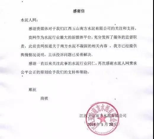 水泥人網(wǎng)報(bào)道的關(guān)于南方水泥不凝固的相關(guān)問(wèn)題,引起了南方水泥的高度重視,隨后江西玉山南方水泥與用戶積極溝通,在最短的時(shí)間內(nèi)為用戶解決了相關(guān)問(wèn)題。江西玉山南方水泥有限公司對(duì)于水泥人網(wǎng)的作法表示高度認(rèn)可,并表示,水泥人網(wǎng)作為行業(yè)最大的新媒體平臺(tái),充分發(fā)揮了媒體的監(jiān)督職責(zé),感謝水泥人網(wǎng)秉承公平公正的原則給矛江西玉山南方水泥的支持和幫助。